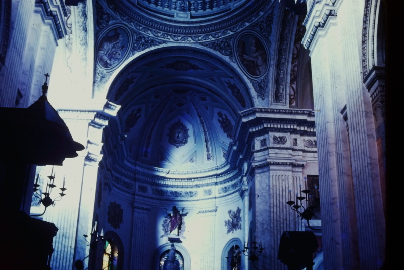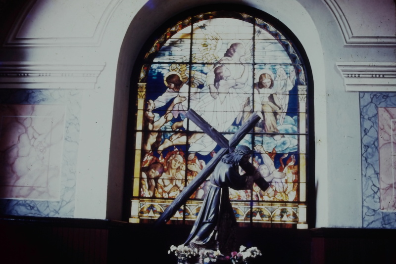 Stained glass and Jesus Christ sculpture carrying the cross inside of the San Juan cathedral.