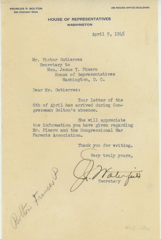 Correspondencia de Cong. F. P. Bolton a Víctor Gutiérrez, secretario de Jesús T. Piñero en Washinton, D. C.
