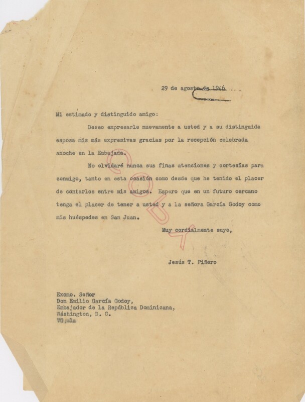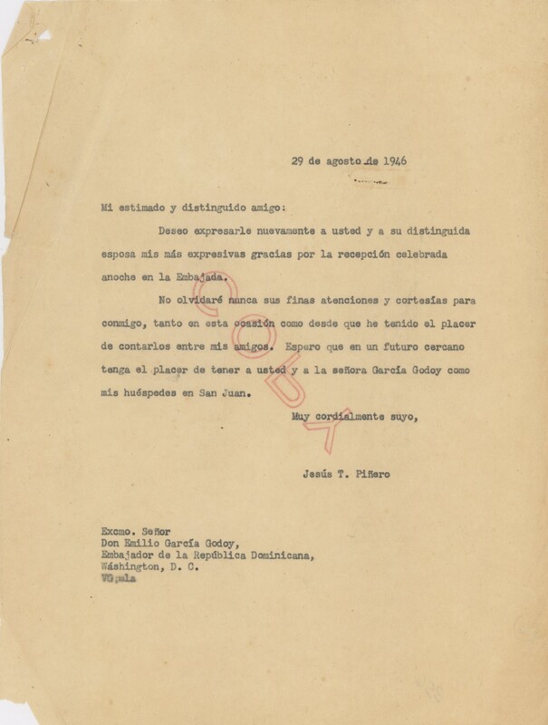 Correspondencia de Jesús T. Piñero a Emilio García Godoy, Embajador de la República Dominicana en Washington, D. C.