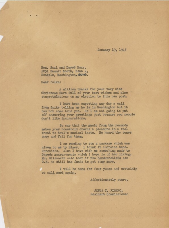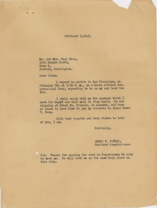Correspondencia de Jesús T. Piñero a Mr. & Mrs. Saul Haas.