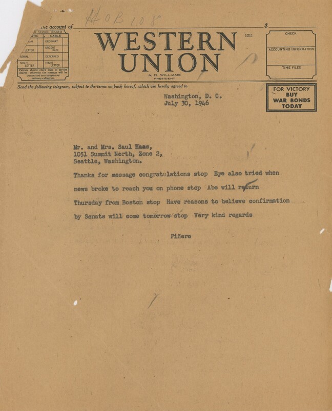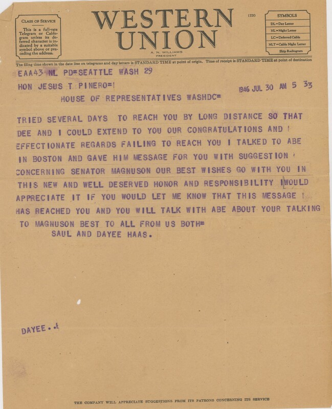 Telegrama de Saul & Dayee Haas para Jesús T. Piñero.