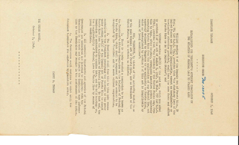Executive Order: “Establishing the President’s Advisory Commission on the relation of Federal Laws of Puerto Rico”.