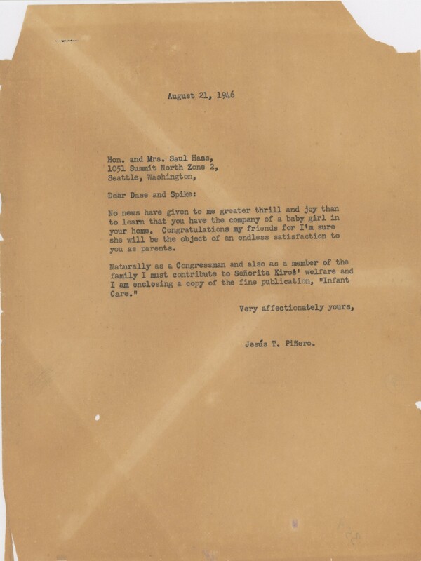Correspondencia de Jesús T. Piñero a Mr. & Mrs. Saul Hass.