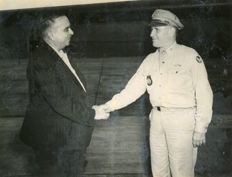 Gob. Piñero saluda al Pres. Truman a su llegada al aeropuerto de Isla Grande.