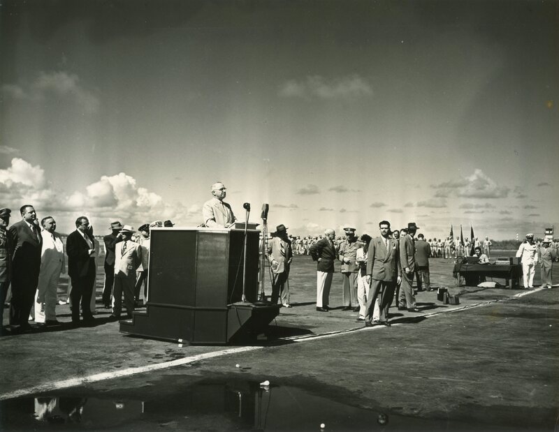 Pres. Truman pronuncia discurso en aeropuerto de Isla Grande.
