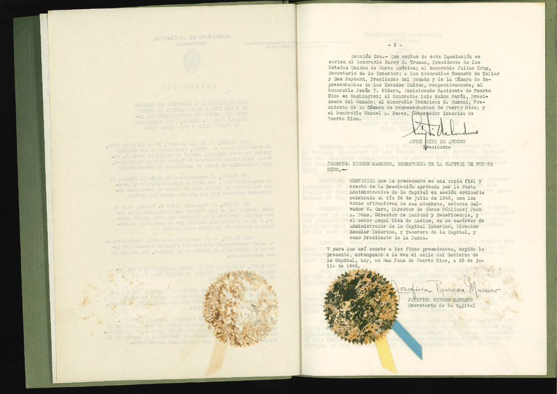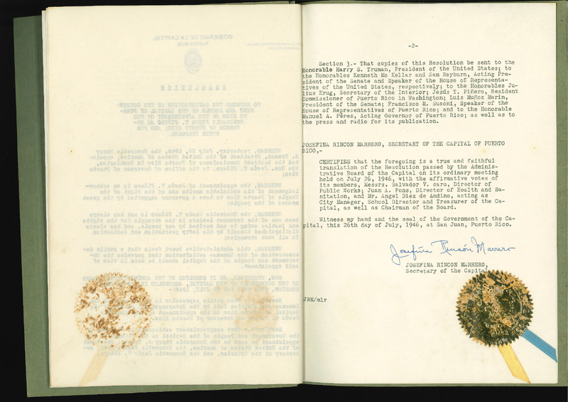 Resolución: “Para testimoniar el regocijo del gobierno de la capital de Puerto Rico con Motivo de nombramiento del honorable Jesús T. Piñero, para Gobernador de Puerto Rico y para otros fines”.