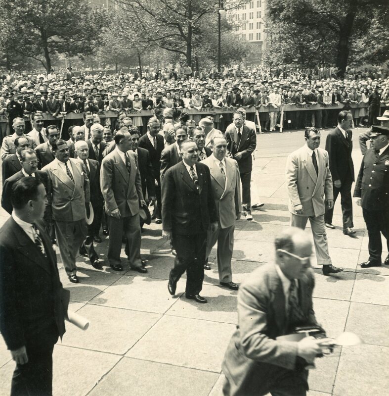 “Governor-select Piñero and Mayor O’Dwyer (NYC) walking to City Hall”.