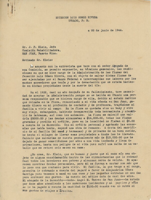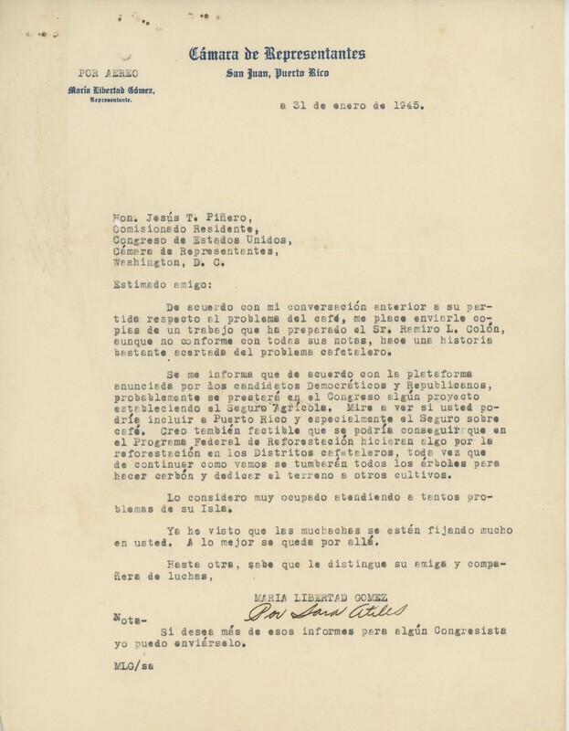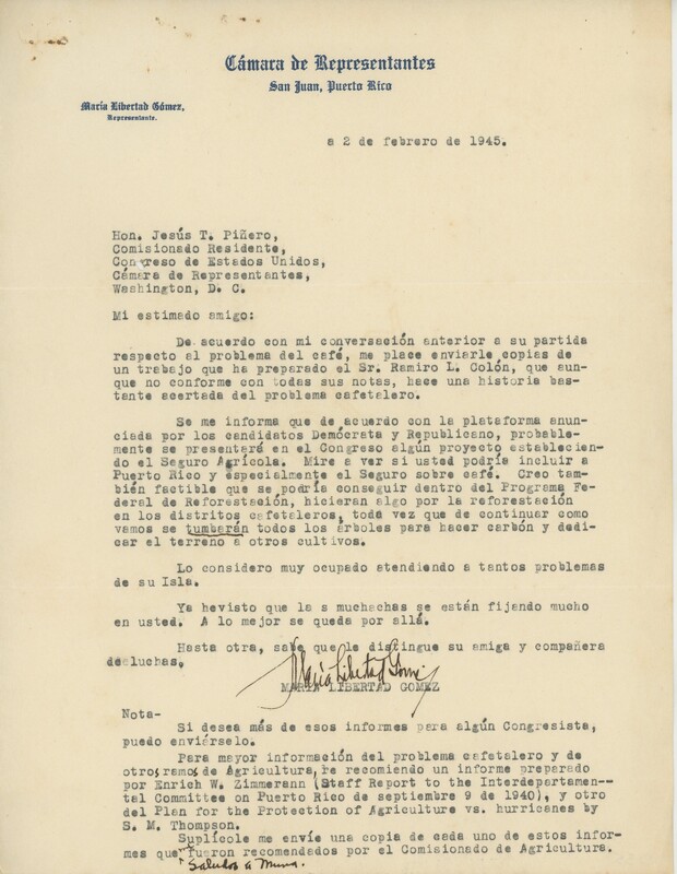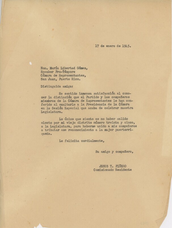 Correspondencia de María Libertad Gómez a J. T. Piñero.