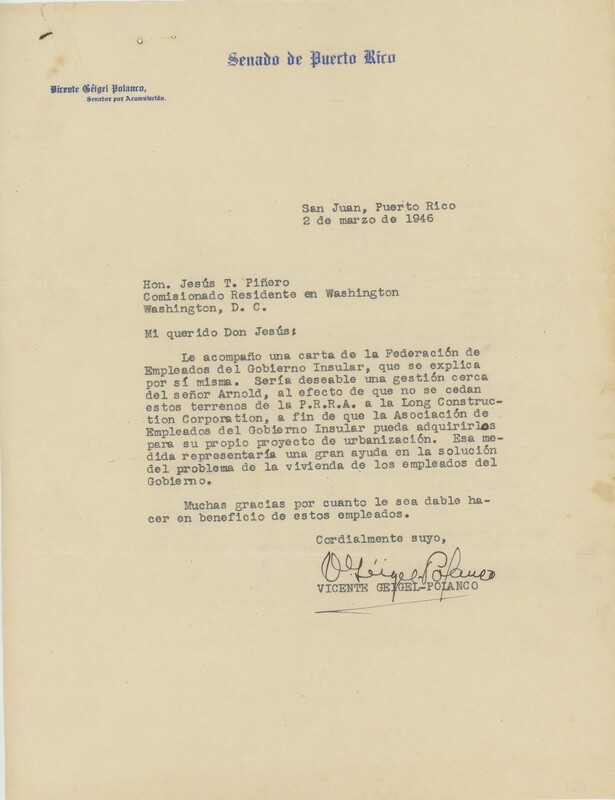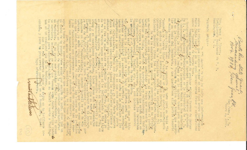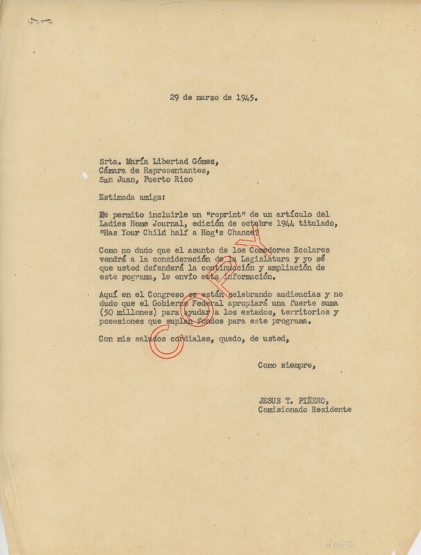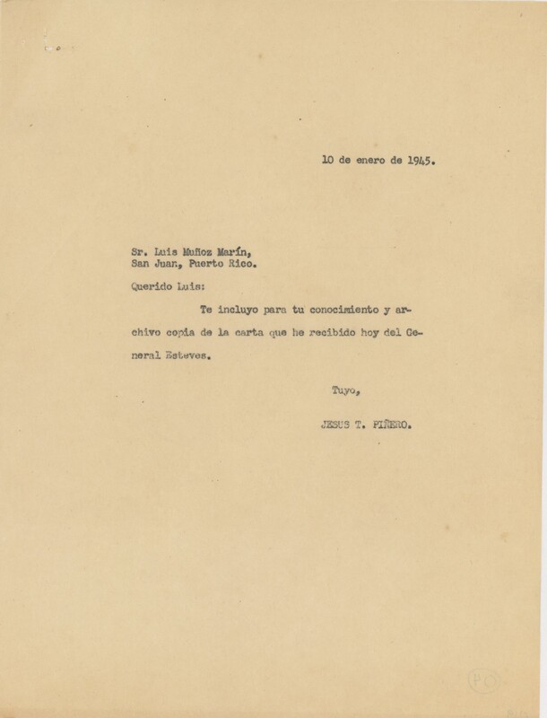 Correspondencia de Jesús T. Piñero a Luis Muñoz Marín.