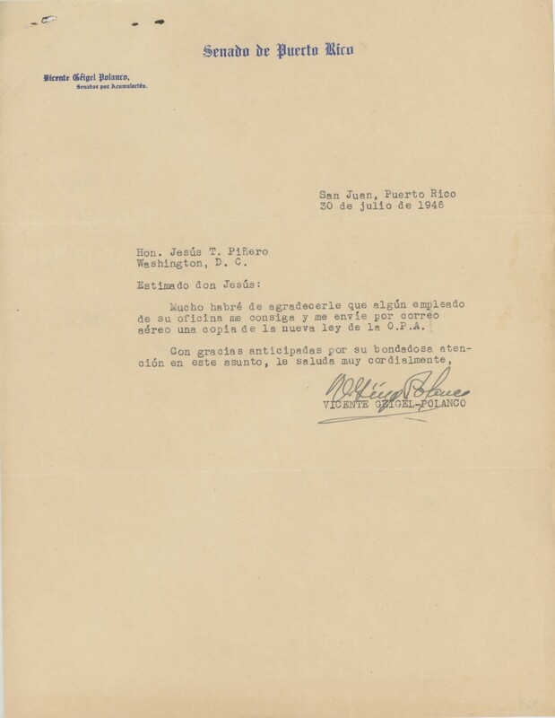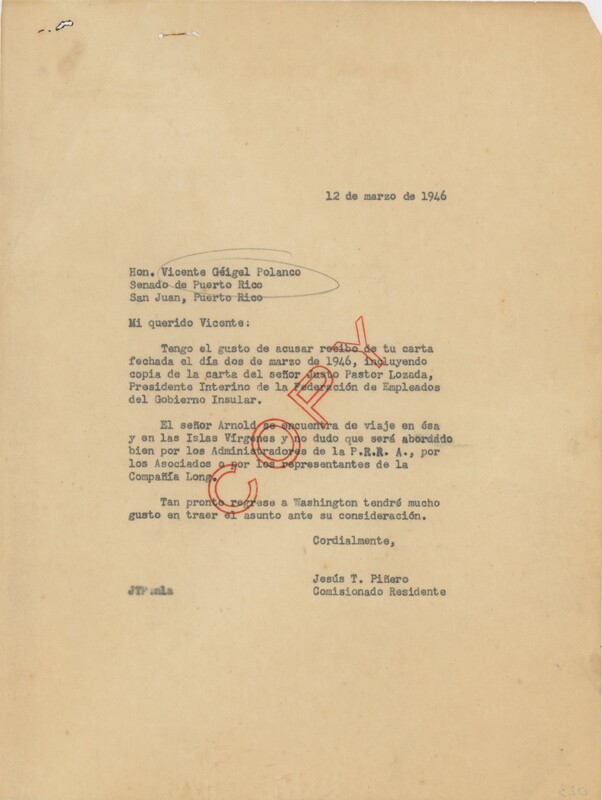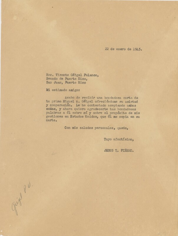 Correspondencia de V. Géigel Polanco a Jesús T. Piñero.
