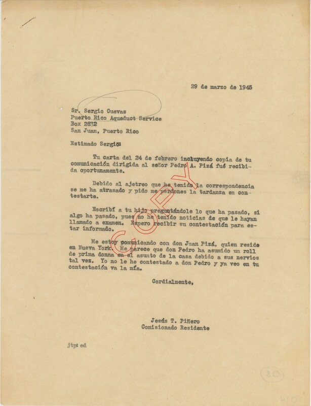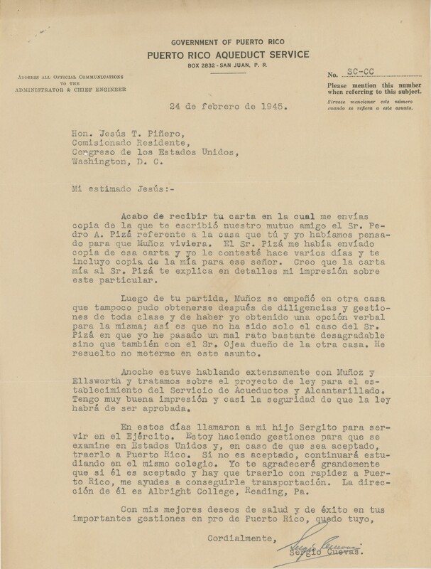 Correspondencia de Jesús T. Piñero a Sergio Cuevas, Jr.