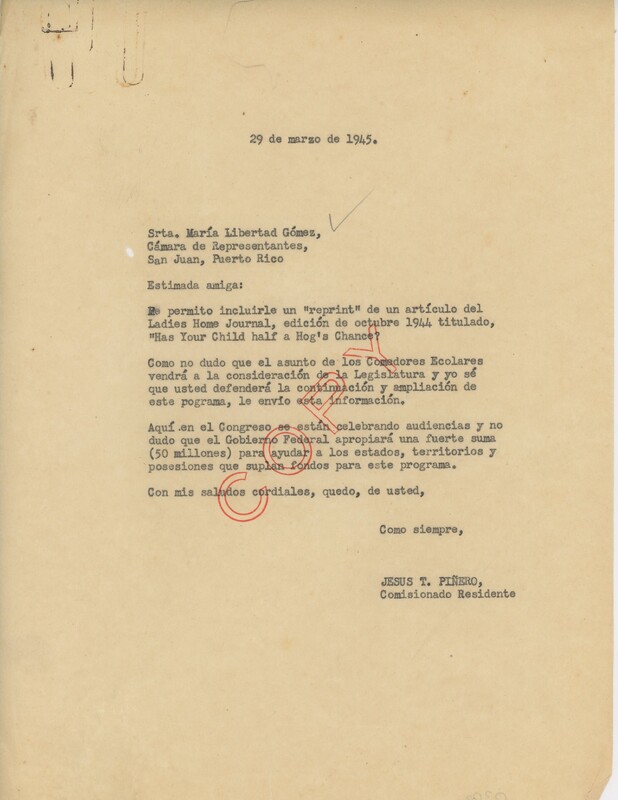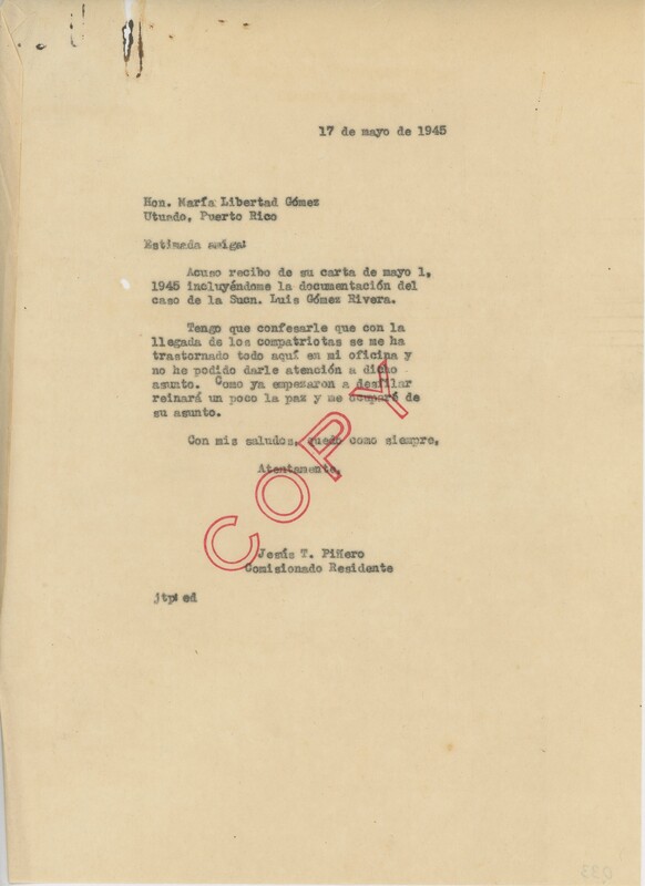 Correspondencia de María Libertad Gómez a J. T. Piñero.