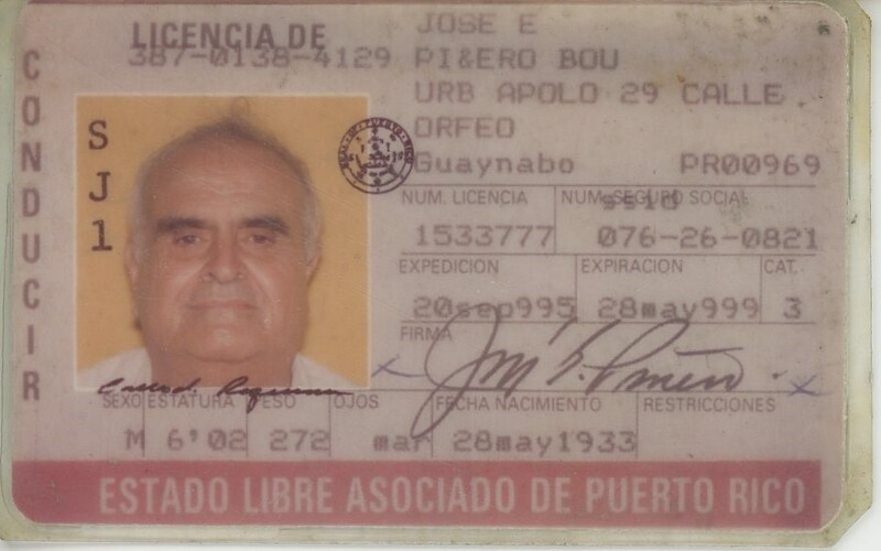 Licencia de conducir de José E. Piñero Bou con laminado.